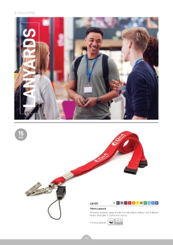 ID SOLUTIONS LANYARDS 15 mm LN-011 W BK GY M R O Y BG GR SBL RB NB 15mm Lanyard Polyester material Lanyard with Crocodile Hook, Safety Lock & Mobile Holder, Available in 12 different colours. Printing Options : SUBLIMATION 334